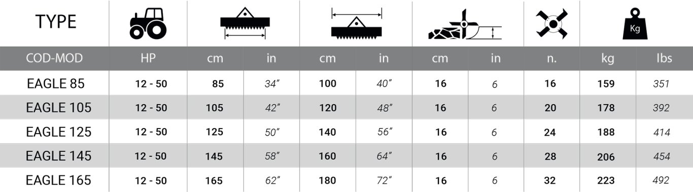 3 POINT HITCH, CATEGORY 1 ONE PIECE, 4 MM STEEL FRAME CAST IRON GEARBOX 540 RPM CHAIN DRIVE ASA 80 IN OIL BATH WITH AUTOMATIC TENSIONER ROTOR WITH 4 HOES PER FLANGE OPTIONAL 6 HOES PER FLANGE SIDE SHIFT THROUGH MOVEABLE 3 POINT HITCH COUPLINGS ADJUSTABLE SKIDS UNIVERSAL PTO SHAFT CATEGORY 4